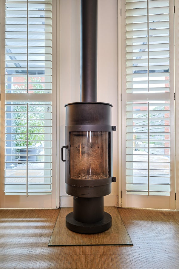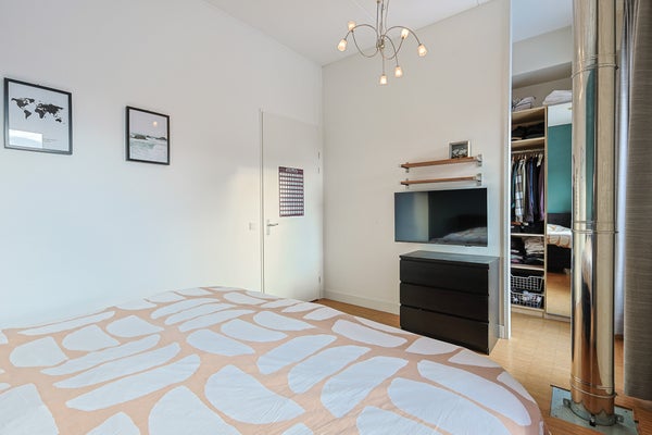 Deze ruime slaapkamer beschikt over twee grote kiep-kantelramen, bamboe parket en een walk-in closet. De pijp van de houtkachel loopt door deze ruimte.