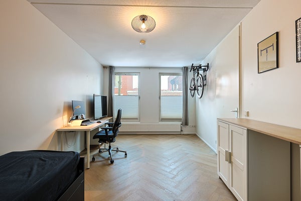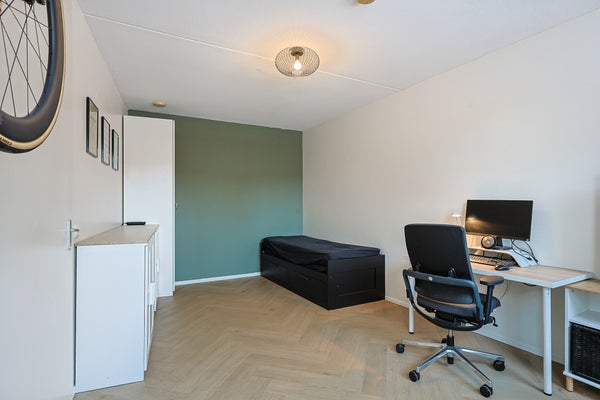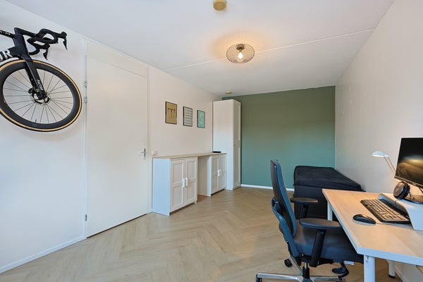 Deze kamer is voorzien van dezelfde pvc-visgraatvloer en beschikt over twee grote draai-kiepramen die zorgen voor veel lichtinval. De ruimte is geschikt als slaapkamer, werkkamer of hobbyruimte.