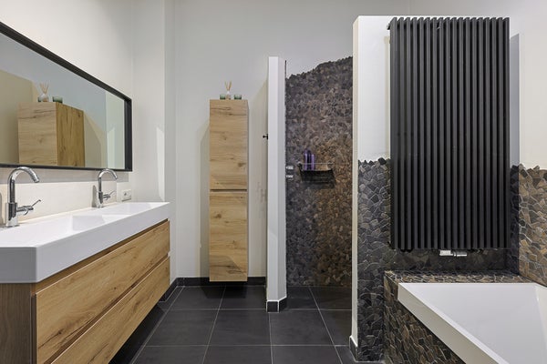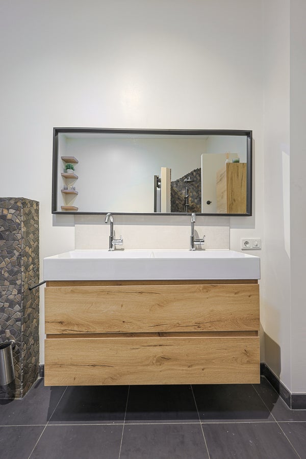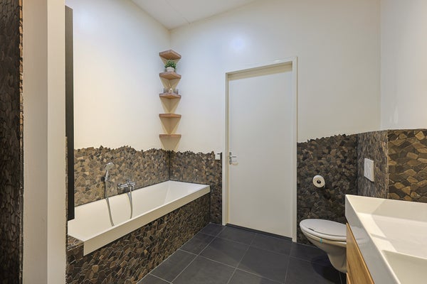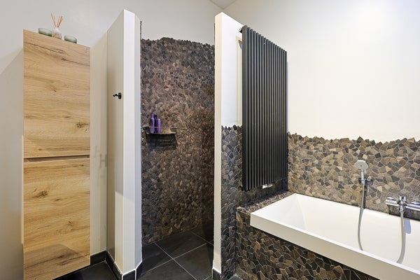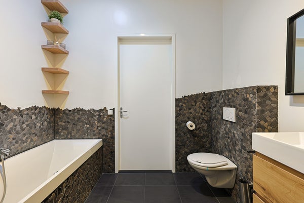 De badkamer is deels gerenoveerd in 2023 en beschikt over een ligbad, inloopdouche en een dubbele wastafel met meubel. Dankzij de leidingen onder de vloer voelt de ruimte aangenaam warm. Een solar tube zorgt voor daglicht.