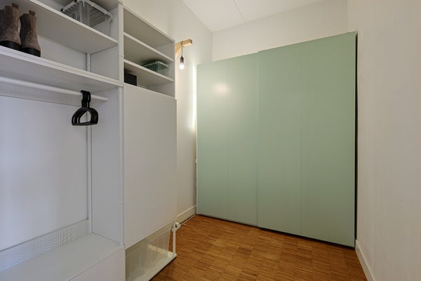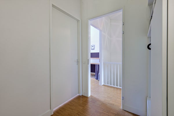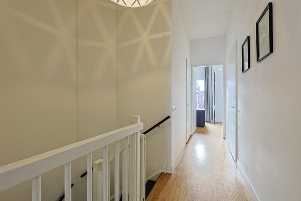 Vanaf de overloop bereik je een extra ruimte die momenteel wordt gebruikt als kastenkamer. Een kozijn is aanwezig, zodat de ruimte afgesloten kan worden met een deur.