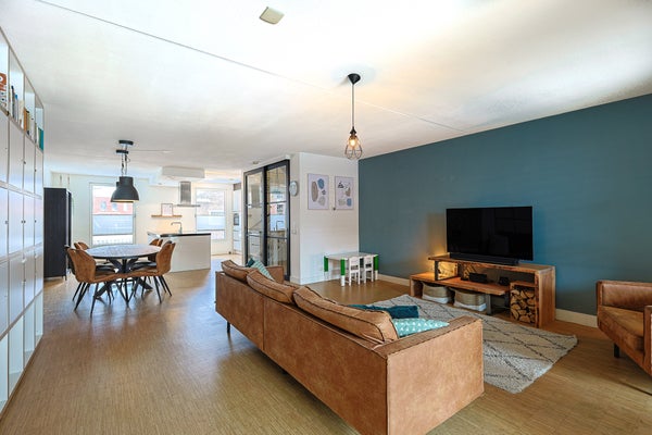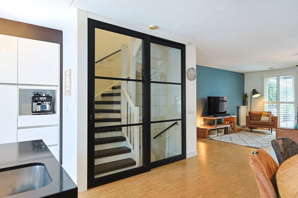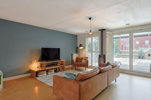 De woonverdieping is bereikbaar via een gerenoveerde trap (2020) met schuifdeur. De woonkamer is ruim en licht en staat in open verbinding met de eetruimte en keuken. In 2022 zijn in de woonkamer zwarte schuifdeuren geplaatst, wat zorgt voor extra warmte en geluidscomfort op de woonverdieping. De vloer is afgewerkt met bamboe parket en er is een houtkachel aanwezig, waarvan de schoorsteen in 2025 is geveegd.