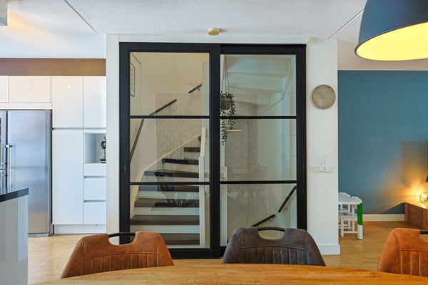 De tweede verdieping is bereikbaar via een vaste trap met schuifdeuren en geluiddempende vinyl trapbekleding.