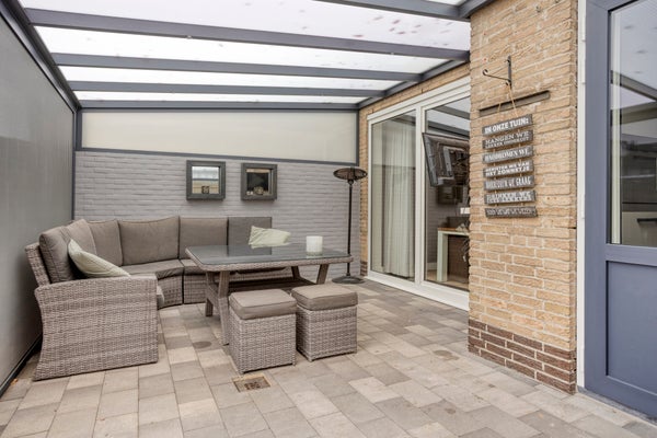 De achtertuin is onderhoudsvriendelijk aangelegd met sierbestrating, plantenbakken en voldoende ruimte voor een lounge- of eethoek. De achterom is ideaal voor fietsen of tuinmaterialen. De grote overkapping aan de woningzijde maakt dat je verlengd kunt genieten van het buitenseizoen.