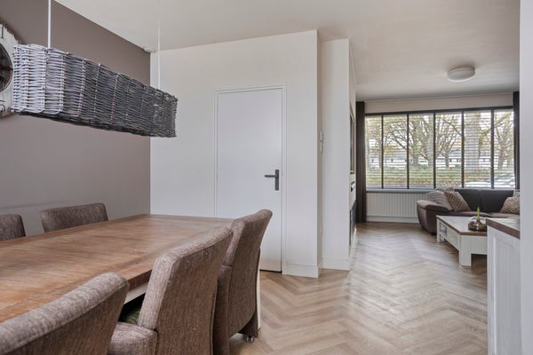 De Z-vormige living is een heerlijke, lichte ruimte dankzij het grote raam aan de voorzijde (met zicht op groenvoorziening) en de brede schuifpui aan de achterzijde. De strakke wand- en plafondafwerking, in combinatie met de pvc-vloer in visgraat, geeft direct een luxe uitstraling. De ingebouwde (elektrische) sierhaard zorgt voor extra sfeer en warmte. Tevens is er een bergkast met voorraadruimte aanwezig, met vernieuwde elektragroepenkast.