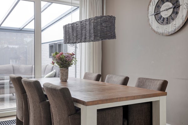 Aan de achterzijde bevindt zich de eethoek met zicht op de tuin. De keuken is modern uitgevoerd in een praktische L-opstelling en voorzien van een composiet werkblad en inbouwapparatuur: o.a. een gaskookplaat, afzuigkap, koelkast, vriezer, vaatwasser en een boiler., alsmede een extra wandmeubel met een apothekerskast en combi-oven/magnetron. Vanuit de eethoek heb je direct toegang tot de ruime terrasoverkapping met verlichting: een ideale plek om het hele jaar door te genieten. De screens bieden daarnaast extra beschutting en privacy.