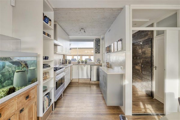 - Lichte woonkamer en moderne open keuken met stijlvolle apparatuur, inclusief praktische voorraadkast.