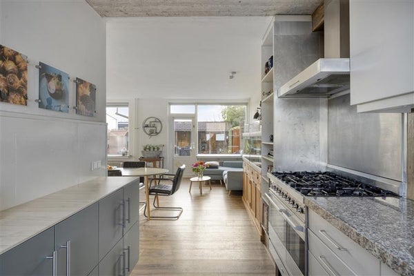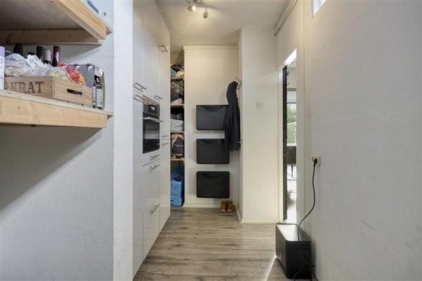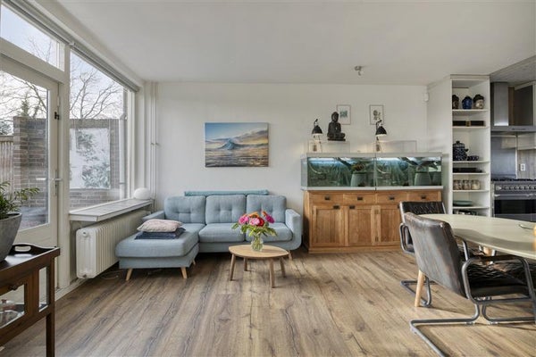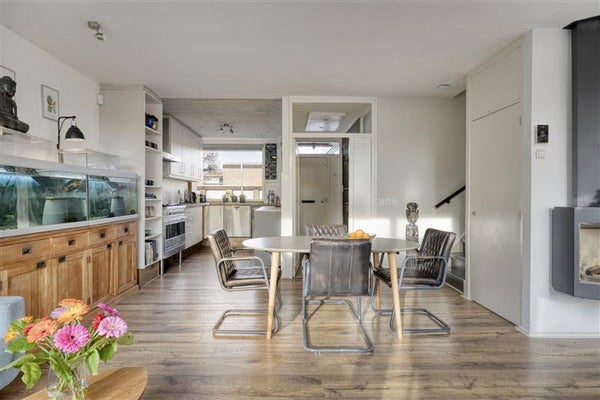 Vanuit de hal met toilet loop je door naar de warme, sfeervolle woning, en je aandacht wordt meteen getrokken door de lichte, ruime woonkamer. De open keuken in U-opstelling en stijlvolle inbouwapparatuur is een echte blikvanger. Denk aan gezellige etentjes met vrienden. Een voorraadkast onder de trap maakt het plaatje compleet — handig én praktisch.
