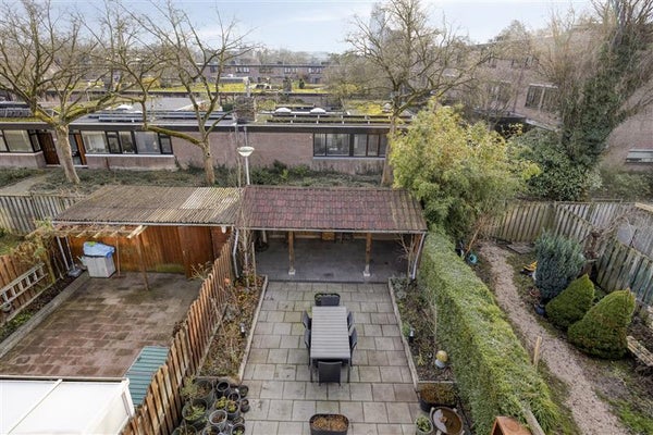 De achterdeur leidt je naar de zonnige achtertuin waar je verbluft wordt door de ruimte en rust. De tuin, gelegen op het zuiden, is dé plek om in de zomer te barbecueën, te zonnen of gewoon lekker te relaxen onder de overkapping met een goed boek en een glas wijn. Binnen handbereik heb je een handige achterom, wat ideaal is voor de fietsers onder ons.