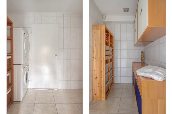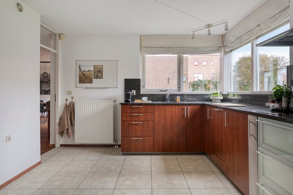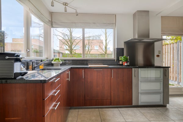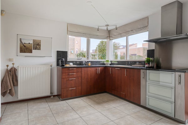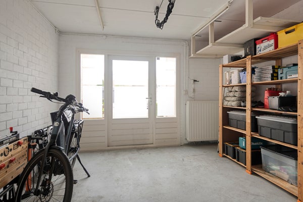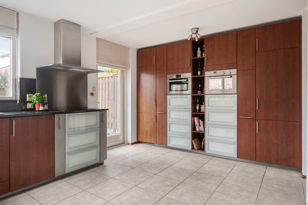 Aan de achterzijde ligt de separate eetkeuken, compleet met een hoek- en wandopstelling voorzien van alle moderne gemakken: een inductiekookplaat, rvs afzuigkap, combi-magnetron, oven, vaatwasser en koelvriescombinatie. Via de keuken heb je toegang tot zowel een praktische bijkeuken als een grote inpandige berging. Ideaal voor fietsen, voorraad of een creatieve invulling zoals een werkplek of hobbyruimte.