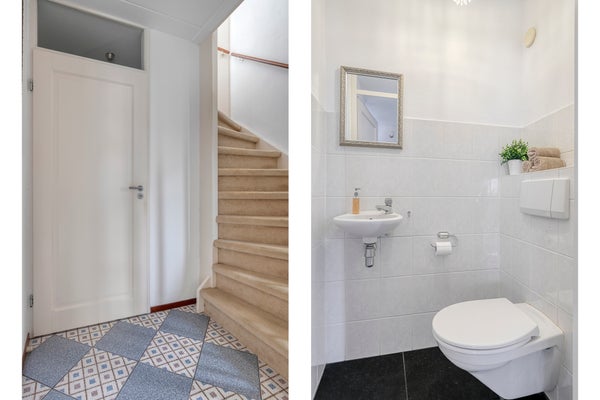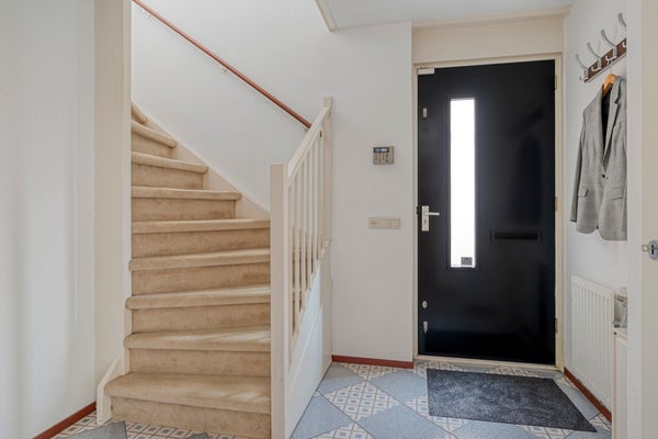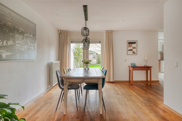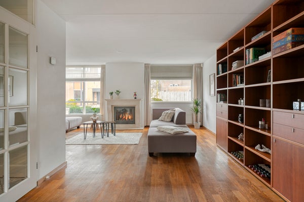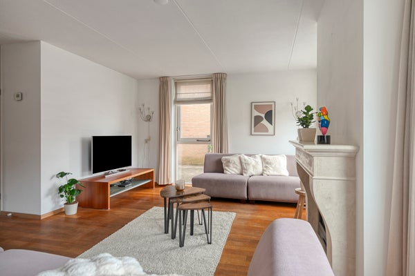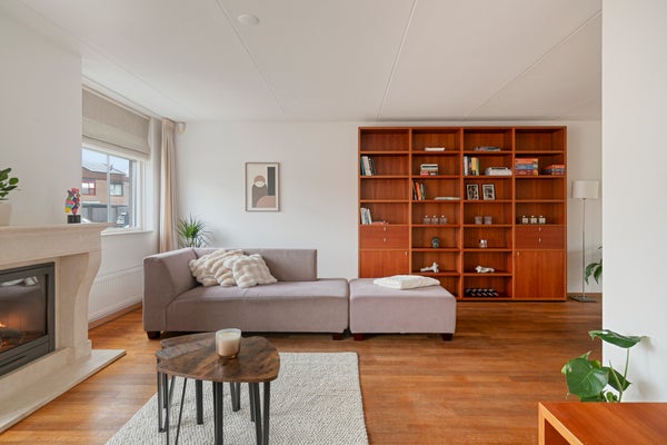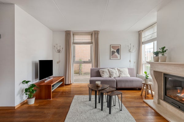 De verzorgde hal met toilet en trapopgang voert je naar een sfeervolle en lichte woonkamer. De houten vloer, de charmante schouw met gashaard en de openslaande deuren naar de tuin zorgen voor een warme, uitnodigende sfeer.