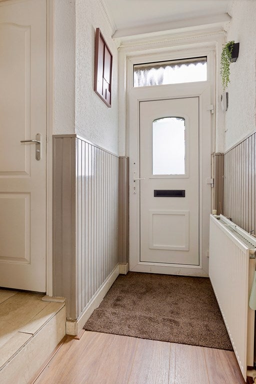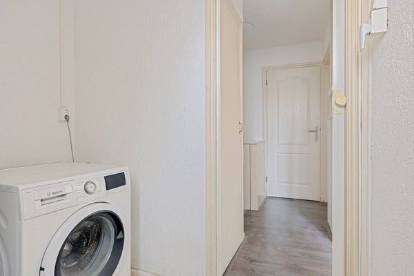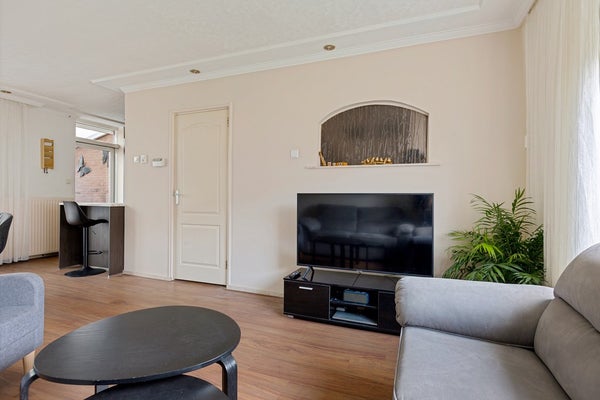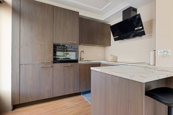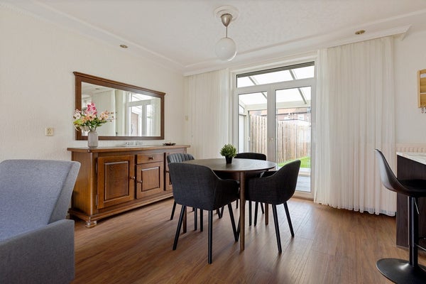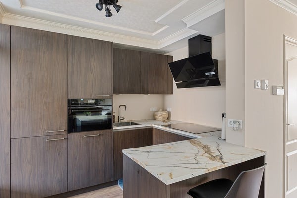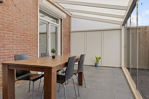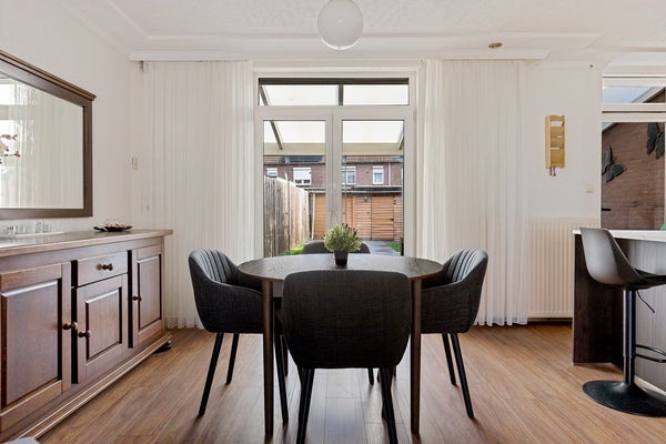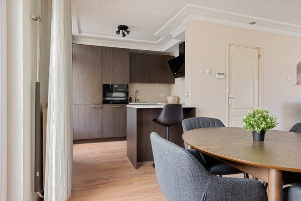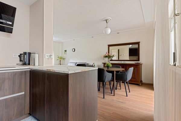 Je komt binnen via de entree met rechts het toilet, de trap naar boven en een handige vaste kast voor jassen, provisie en schoonmaakspullen. Links ligt de woonkamer: een fijne ruimte met plek voor een comfortabele zithoek en een eettafel. Achterin bevindt zich de halfopen keuken, die in 2025 volledig is vernieuwd. Dit is geen cosmetische update, maar een hoogwaardige renovatie: premium materialen, hoog afwerkingsniveau en volledig voorzien van energiezuinige AEG-inbouwapparatuur. Apparatuur én werkzaamheden zijn bovendien nog onder garantie. Vanuit de keuken stap je door naar de serre, een prettige extra ruimte die het wooncomfort vergroot.