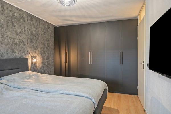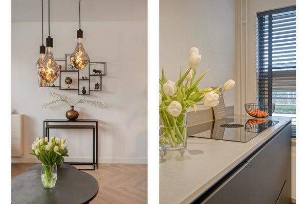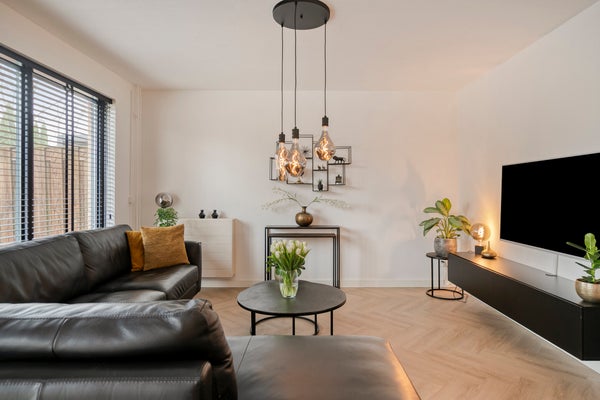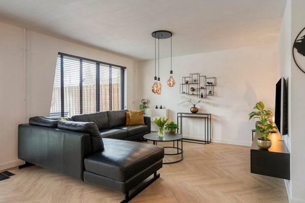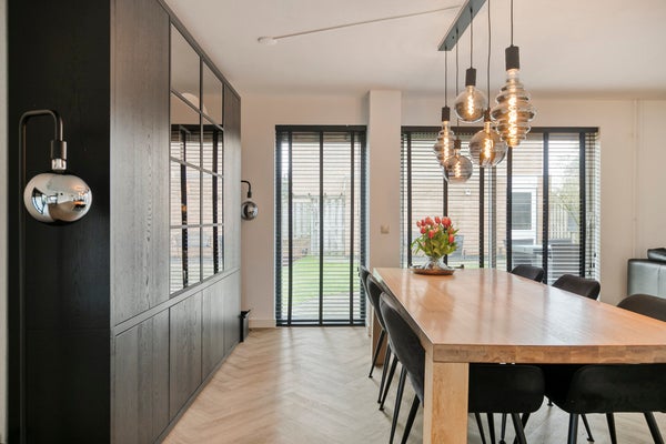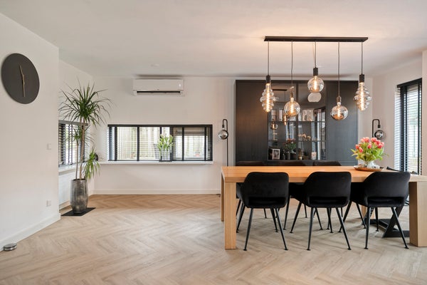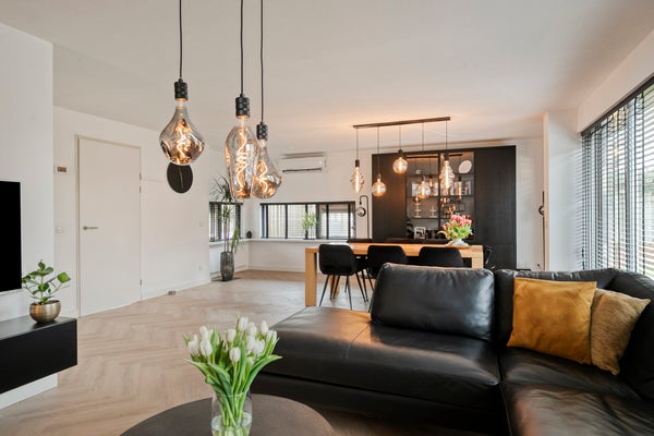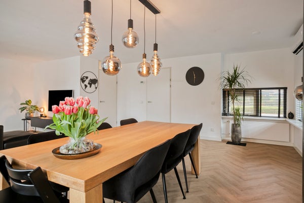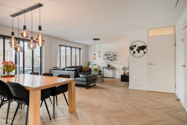De woonkamer is heerlijk licht en ruim van opzet, met grote raampartijen aan meerdere zijden én een fraaie pvc vloer in visgraat motief. Er is volop ruimte voor een comfortabele zithoek én een grote eettafel. De indeling maakt de ruimte bijzonder praktisch en sfeervol.