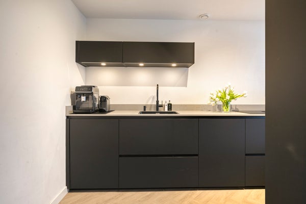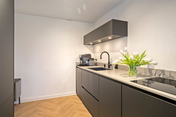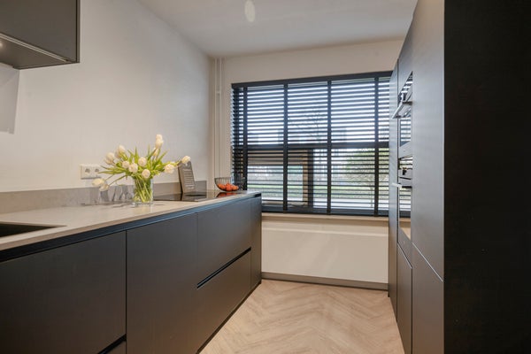 Aan de voorzijde bevindt zich de fraaie keuken, uitgevoerd in een moderne stijl met strakke fronten. De keuken beschikt over diverse inbouwapparatuur zoals een inductie Bora kookplaat met afzuigkoker, Quooker, vaatwasser, combi-magnetron, (stoom)oven, koelkast, vrieslades en biedt voldoende kastruimte. Dankzij het raam is ook hier sprake van fijn daglicht. Vanuit de woonkamer is er directe toegang tot de fraaie achtertuin.