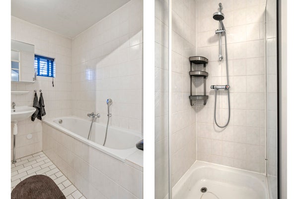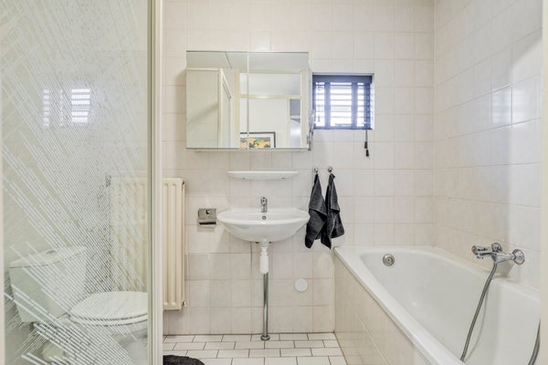 De badkamer is centraal gelegen en compleet uitgevoerd met ligbad, douche, wastafel en toilet.