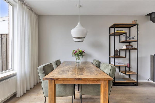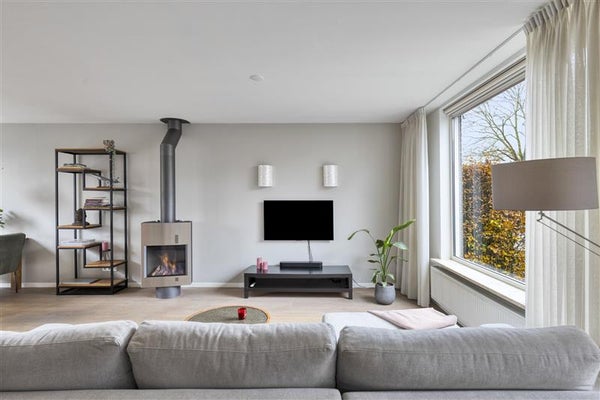 Door de voordeur stap je binnen in een lichte entree. Hier vind je de toegang tot het toilet met fonteintje, de meterkast en de deur richting de woonkamer. De woonkamer voelt knus aan door de warme parketvloer en de draaibare gashaard, die garant staat voor vele gezellige avonden. Door de grote ramen valt bovendien heerlijk veel licht naar binnen, waardoor de woonkamer een aangename plek is voor het hele gezin.