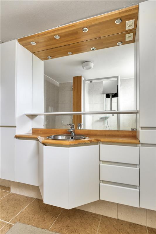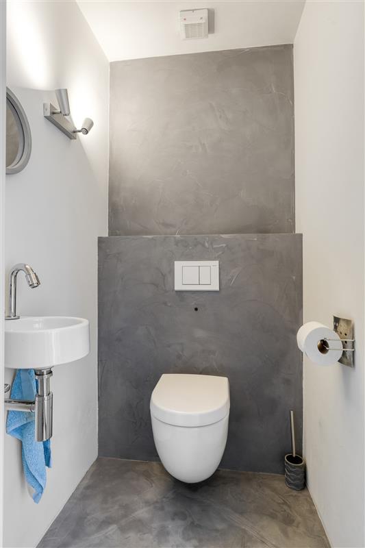 Aan de voorzijde bevindt zich de grote inpandige garage, die met een elektrische roldeur gemakkelijk te openen is. Deze ruimte biedt allerlei mogelijkheden: van kantoor tot atelier, van speelkamer tot praktijkruimte aan huis. Ideaal voor wie werk en privé wil combineren zonder concessies te doen aan leefruimte.
