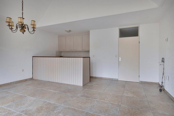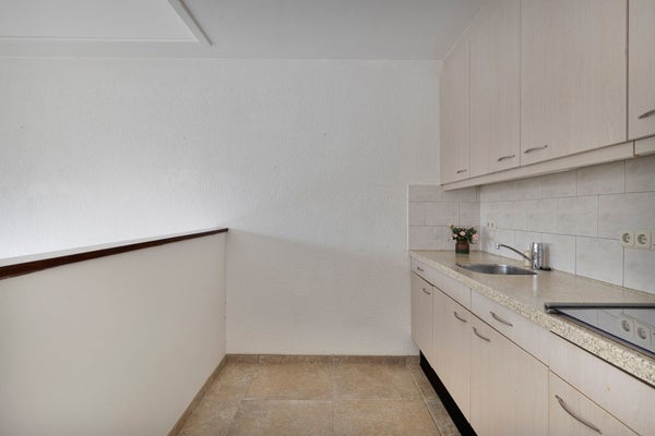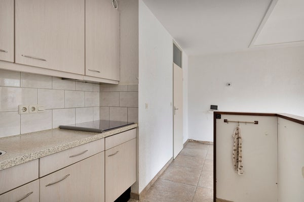 De keuken bevindt zich in open verbinding met de woonkamer en is uitgevoerd in een praktische opstelling met diverse kastruimte en werkblad. Een nette basis die eventueel eenvoudig naar eigen smaak is te vernieuwen.