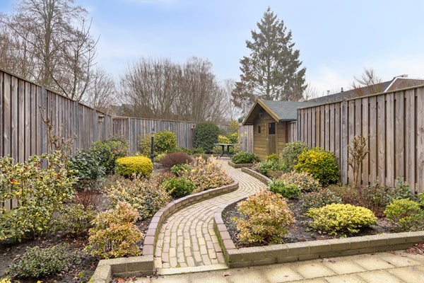 De achtertuin is verzorgd aangelegd met een speels looppad, groenborders en meerdere zitmogelijkheden. De tuin biedt privacy en grenst direct aan het park, wat zorgt voor een bijzonder rustige en groene woonbeleving.