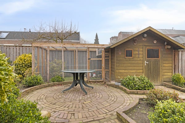 Achter in de tuin bevindt zich een vrijstaande berging, ideaal voor fietsen, tuinmeubilair en opslag.