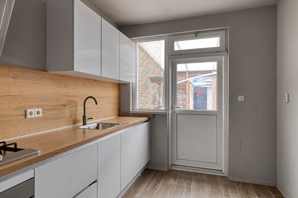 Via de entree kom je binnen in de hal, waar zich het toilet, de trapopgang en de doorgang naar de keuken en woonkamer bevinden. De keuken is ingericht met diverse inbouwapparatuur, waaronder een gaskookplaat, oven, afzuigkap, vaatwasser en een inbouwkoelkast met vriezer.