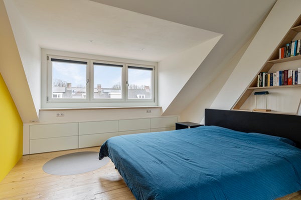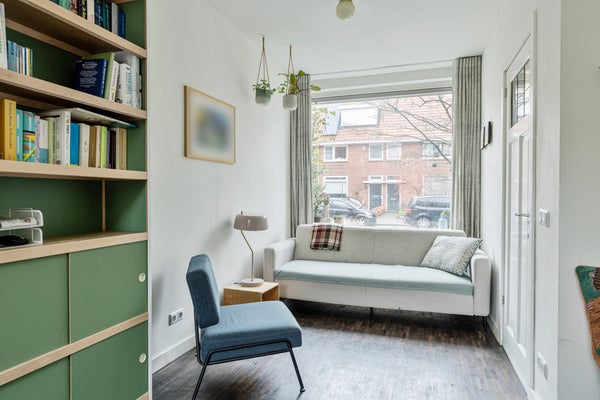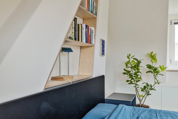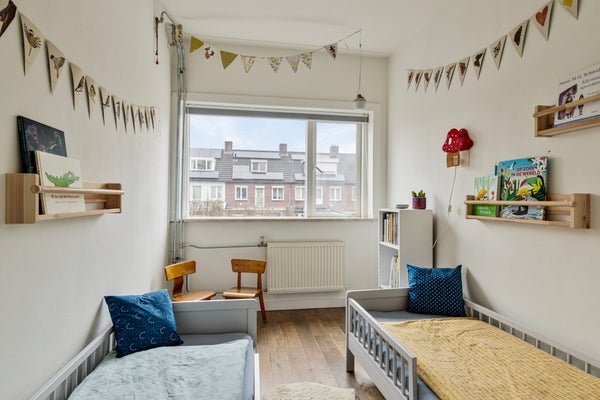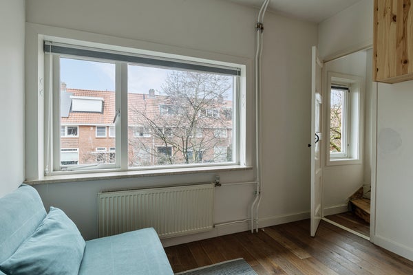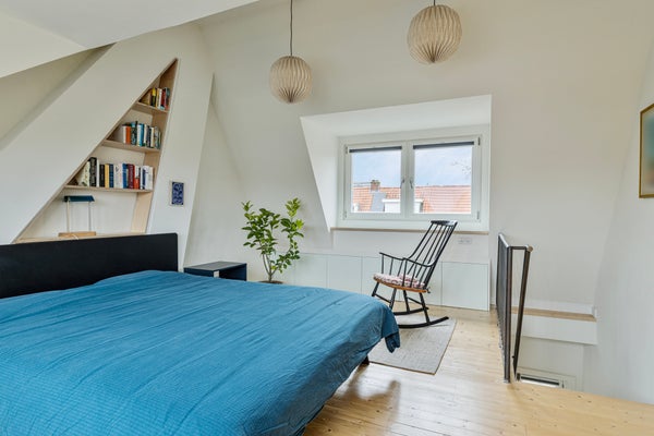 De tweede verdieping is ingericht als ruime slaapkamer en zeer netjes afgewerkt. Aan zowel de voor- als achterzijde is een brede dakkapel geplaatst, beide voorzien van draai-kiepramen en HR++ glas. De cv-ketel (Nefit Proline, 2014, huur) bevindt zich in een vaste kast. Langs beide schuine kanten is veel op maat gemaakte kastruimte aanwezig, wat zorgt voor optimaal gebruik van de ruimte.