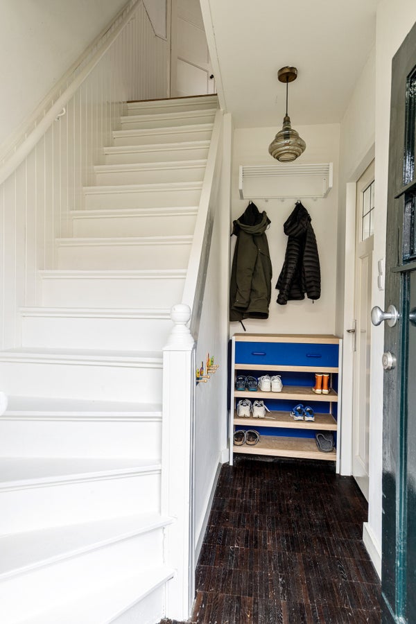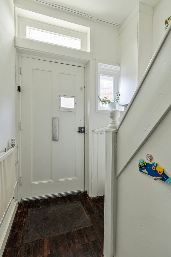 Via de voortuin kom je binnen in de hal, die is afgewerkt met een parketvloer op betonnen ondervloer. Daglicht komt binnen via ramen boven en naast de voordeur. Vanuit de hal heb je toegang tot de woonkamer, de meterkast en de trap naar de eerste verdieping.