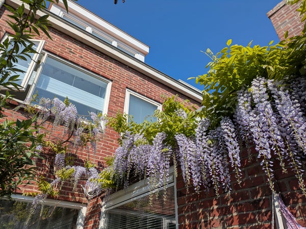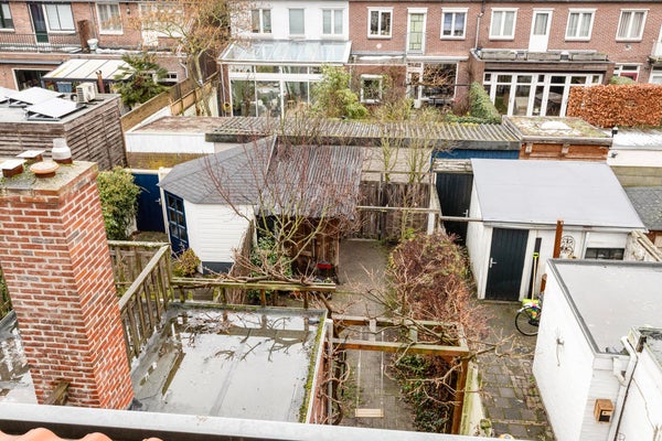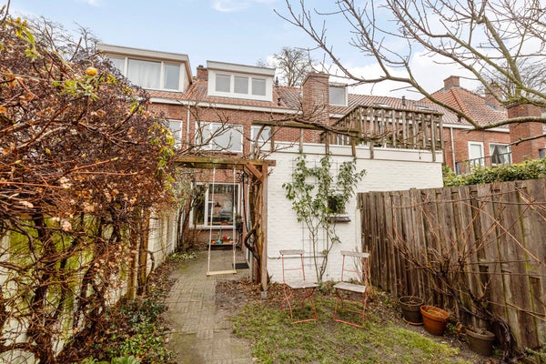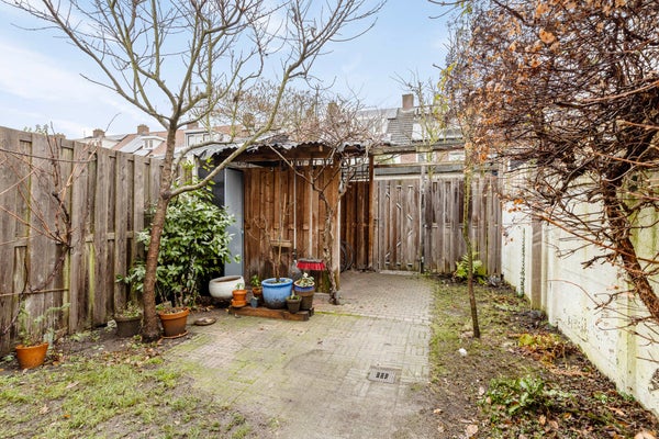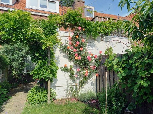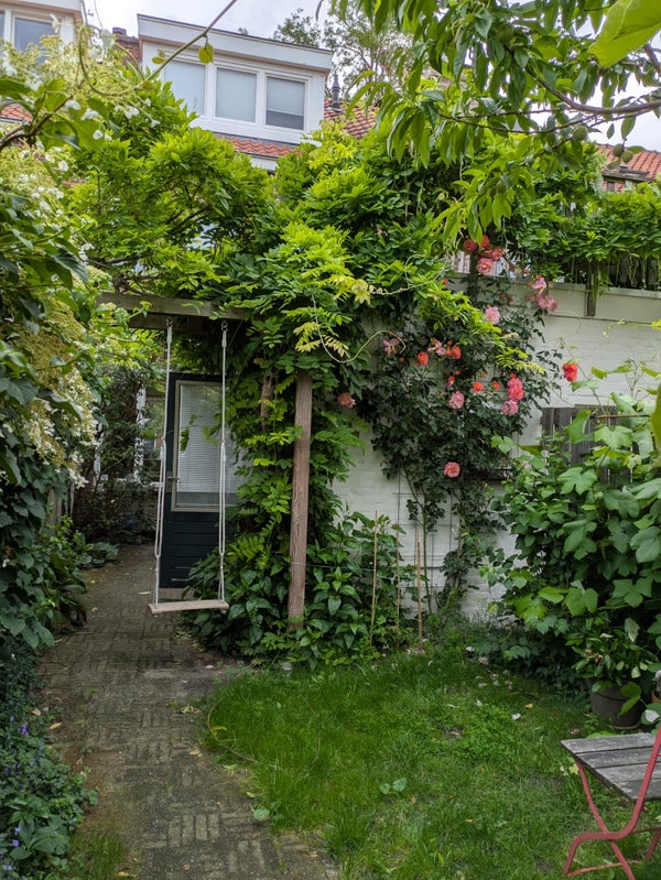 De achtertuin is diep en groen aangelegd, met volwassen beplanting, fruitbomen en een mooie blauwe regen. De tuin beschikt over een achterom en elektra. Een fijne, rustige plek met veel groen en privacy.