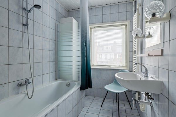 De badkamer is volledig betegeld en voorzien van een ligbad, wastafel en een raam voor daglicht en ventilatie.