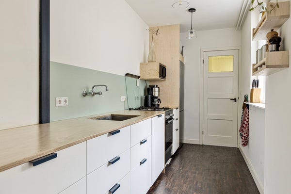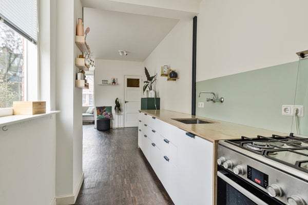 De open keuken sluit aan op het eetgedeelte en beschikt over een lang aanrecht dat deels doorloopt de eetruimte in. De keuken is voorzien van een 4-pits gasfornuis, een Bosch oven en een groep aansluiting voor inductie. Vanuit de keuken is er een deur naar de tuin. Daarnaast is er toegang tot een aparte hal met aansluitingen voor wasmachine en droger, vanwaar ook het toilet bereikbaar is.