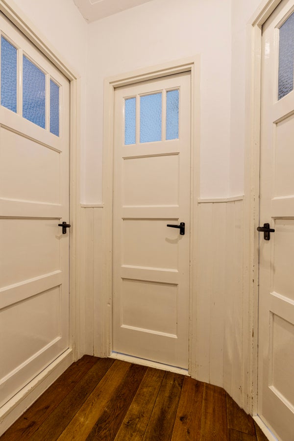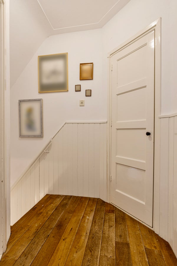 De overloop is afgewerkt met parket en biedt toegang tot twee slaapkamers, de badkamer en een opbergkast.