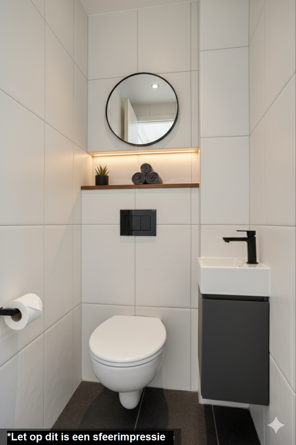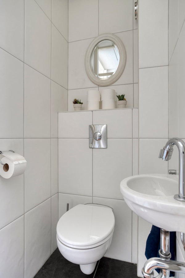Overdekte entree met hal, garderobe, meterkast (8 groepen, 2 aardlekschakelaars), trapkast en modern toilet met hangcloset en fonteintje.