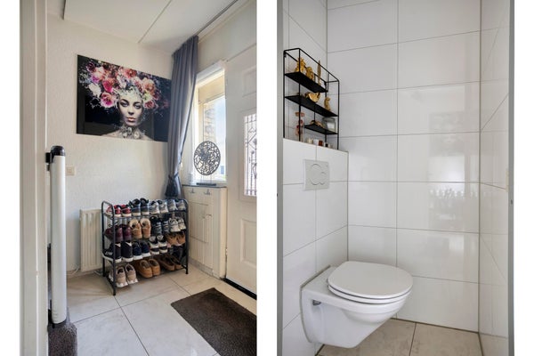 Entree in de hal van de woning met toegang tot het separate toilet, de garage, de trapopgang naar de verdiepingen en doorgang naar de woonkamer.