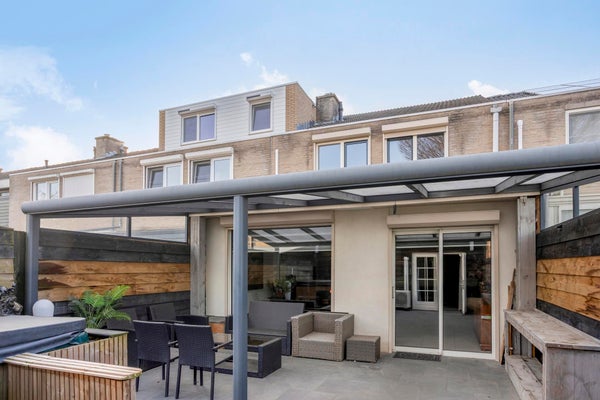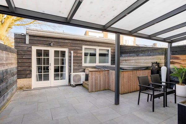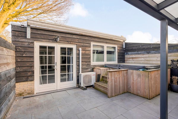 De achtertuin van circa 40 m² is overzichtelijk en onderhoudsvriendelijk aangelegd met jacuzzi en ruime overkapping.