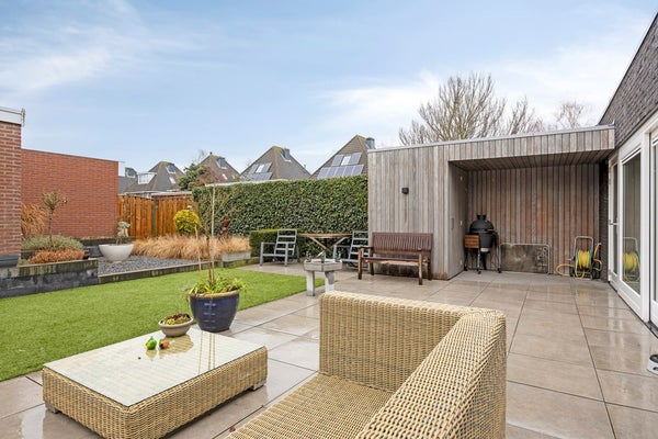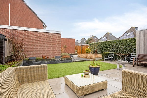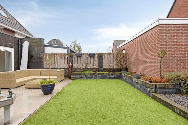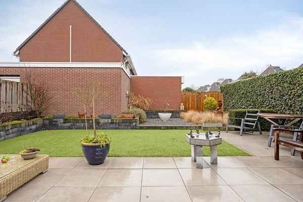 woning grenzend terras met kunststof gazon en volgroeide borders.