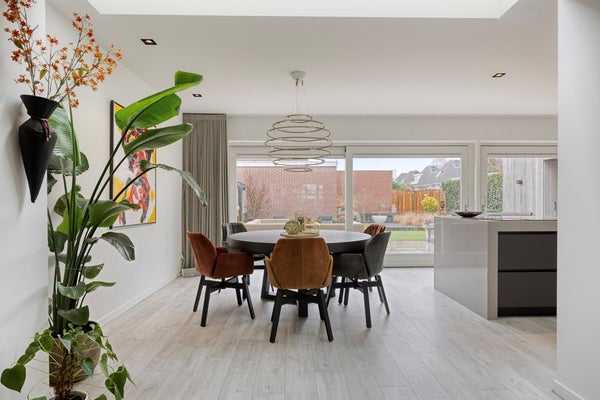 en ruime dubbele open doorgang naar de uitbouw met eethoek en de moderne keuken met