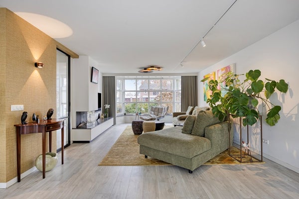 L-woonkamer met erker, gasgestookte openhaard met onderbouw kasten, zithoek, leeshoek