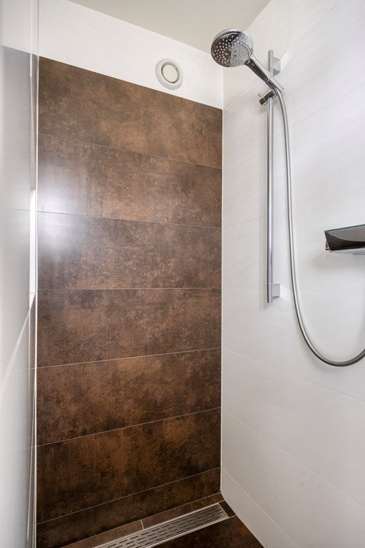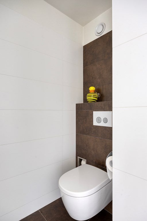 De betegelde moderne badkamer heeft mechanische ventilatie, een wandcloset,