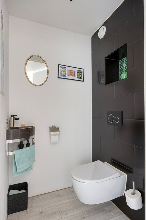 Hal met meterkast, moderne toiletruimte met wandcloset, fonteintje en mechanische