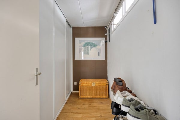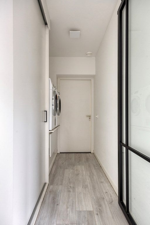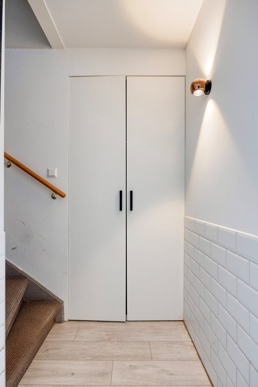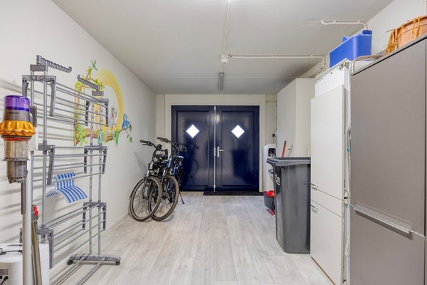 De bijkeuken heeft een vaste kastenwand, de aansluitingen voor wasmachine en droger