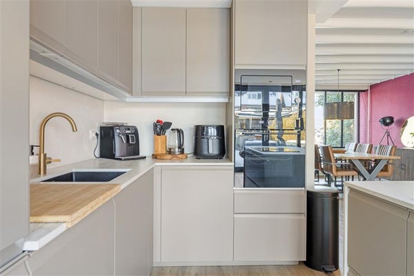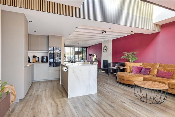 De uitgebouwde en recent vernieuwde living is een oase van ruimte en licht. Grote ramen zorgen voor een mooie daglichtinval, en de moderne vloer mét vloerverwarming voelt heerlijk comfortabel aan, zelfs op een frisse ochtend. Hier stel je je al voor hoe je 's avonds gezellig op de bank ploft na een lange dag.