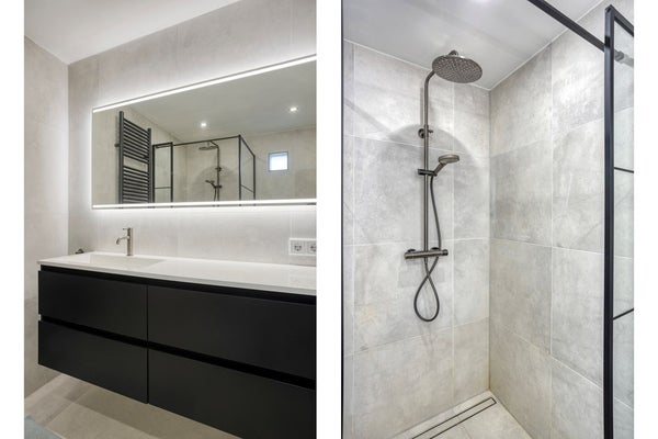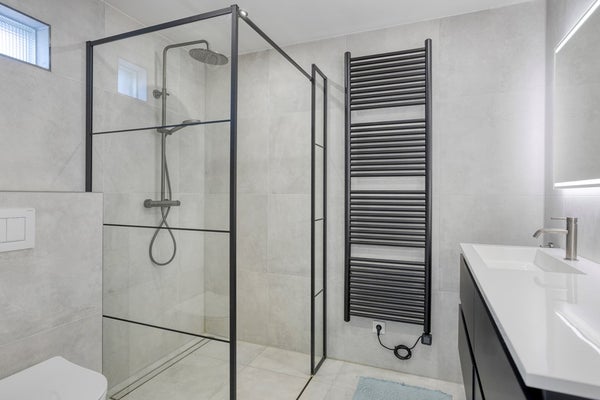 De ruime badkamer is in 2023 volledig vernieuwd en uitgerust met een inloopdouche, wastafelmeubel met wastafel en verwarmde spiegel, tweede toilet, handdoekradiator en mechanische ventilatie.
