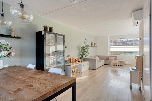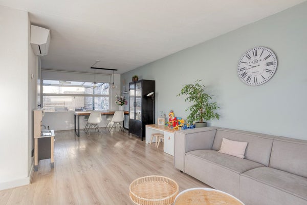 De doorzonwoonkamer heeft een mooie lichtinval door de grote raampartij aan zowel de voorzijde als de achterzijde en is voorzien van een laminaatvloer met vloerverwarming. Tevens is er een airconditioning geplaatst. Onder de trap bevindt zich een handige trapkast, ideaal om spullen op te bergen.