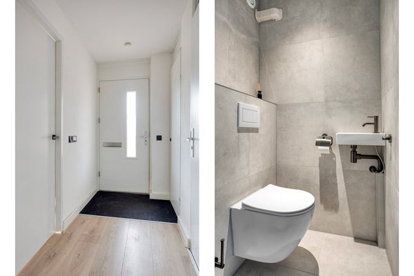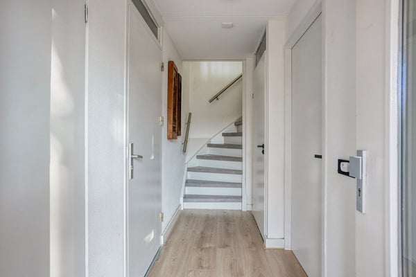 Entree met volledig vernieuwde meterkast, opgaande trap met vernieuwde trapbekleding, toiletruimte met closet en fonteintje, toegang tot de garage en toegang tot de woonkamer.