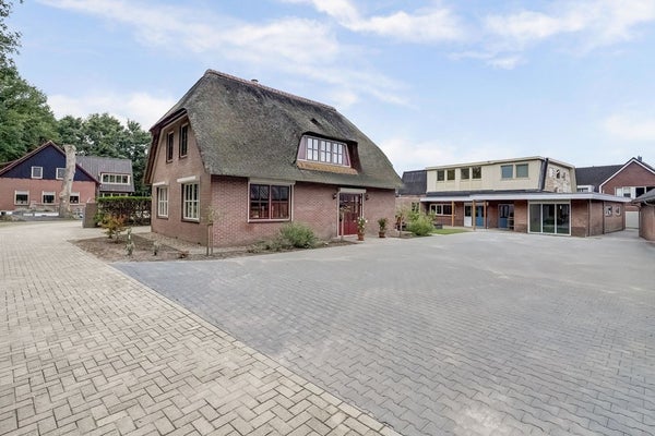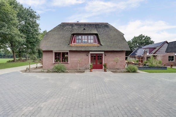 Aan dit deel van de Uddelerweg liggen 6 woningen. Dankzij de ligging aan een rustige straat met enkel bestemmingsverkeer geniet je hier van volop rust en privacy. Nummer 44 is de één na laatste woning. Dit maakt het een bijzonder rustig straatje. Je rijdt de weg op met aan de linkerzijde het weiland. Bijna aan het eind van de straat draai je rechts het erf op. Wat een waanzinnige plek is dit! De vrijstaande woning met de rieten kap is een mooie verschijning.