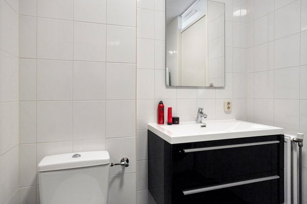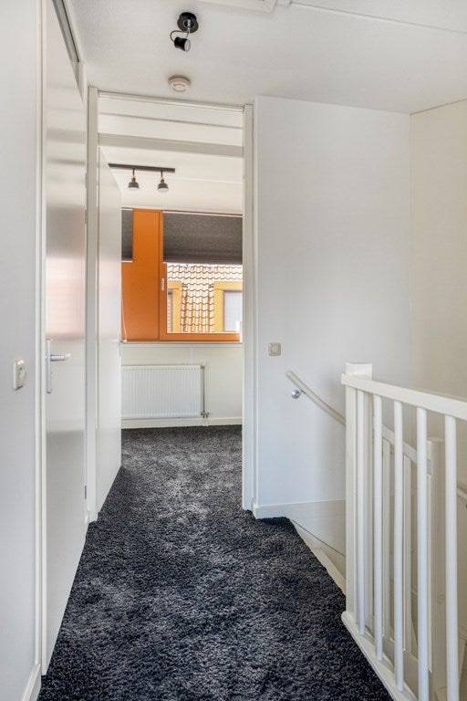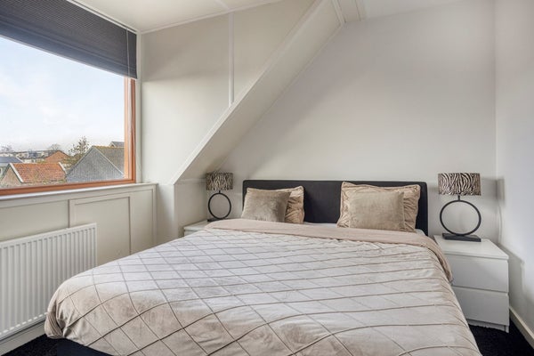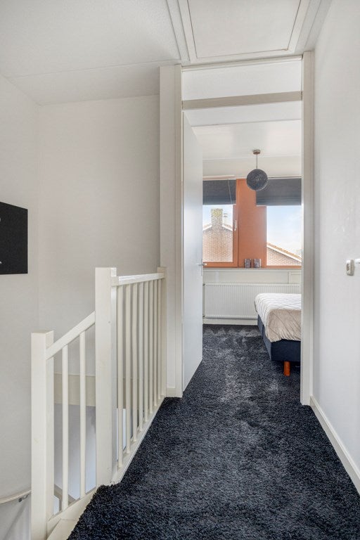 Via de trap in de woonkamer bereikt u de overloop van de eerste verdieping, waar twee volwaardige slaapkamers en de badkamer zich bevinden. Aan de achterzijde bevindt zich de hoofdslaapkamer, de tweede kamer is aan de voorzijde gesitueerd. Dankzij de brede dakkapellen profiteren beide kamers van prettig daglicht en een comfortabele maatvoering. Centraal op de verdieping ligt de modern afgewerkte badkamer, uitgerust met een inloopdouche, wastafelmeubel en tweede toilet. De combinatie van lichte wandtegels en een donkere vloer zorgt voor een rustige, tijdloze uitstraling. Ook de witgoedaansluitingen zijn hier praktisch geïntegreerd, waardoor de indeling efficiënt en doordacht blijft.