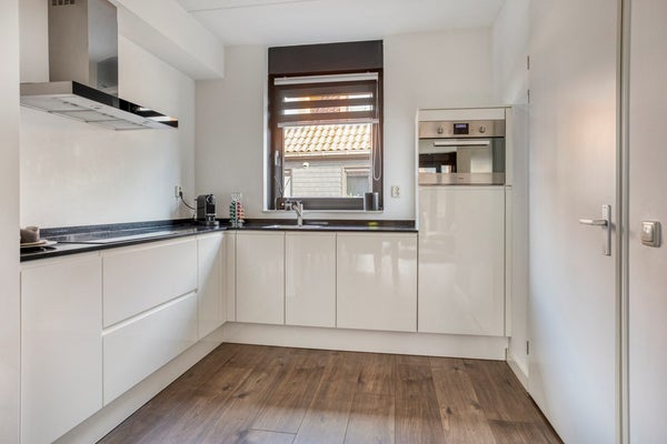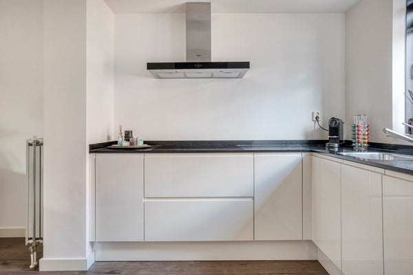 Aan de voorzijde bevindt zich de moderne hoekkeuken, uitgevoerd in hoogglans wit met een donker contrasterend werkblad. De keuken is voorzien van een inductiekookplaat met afzuigkap, combi-oven, vaatwasser en koelkast. Dankzij de slimme indeling beschikt u hier over comfortabele werkruimte en voldoende kastruimte.