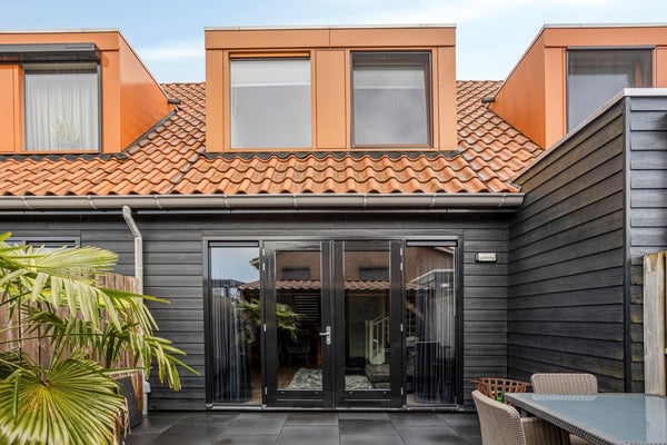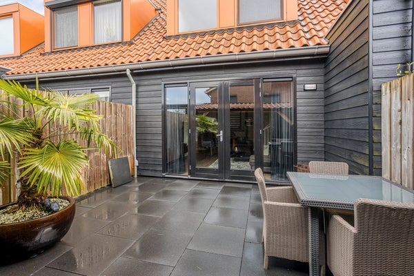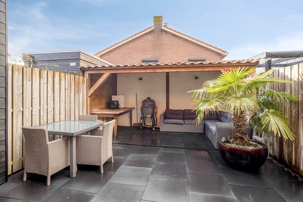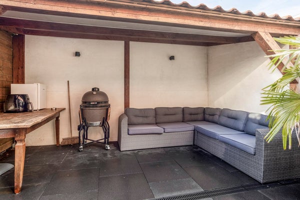 De achtertuin is onderhoudsvriendelijk aangelegd met grote antracietkleurige tegels en volledig omsloten door houten schuttingen, wat zorgt voor privacy. Direct grenzend aan de woning ligt het terras bij de openslaande deuren, waardoor u op zonnige dagen moeiteloos binnen en buiten combineert. Achter in de tuin bevindt zich een sfeervolle houten overkapping met verlichting. Hier is ruimte voor een comfortabele loungehoek, waardoor u beschut kunt genieten, ook wanneer het weer minder stabiel is. De tuin is overzichtelijk, verzorgd en functioneel ingericht — precies passend bij het karakter van de woning.