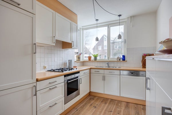 Entree, hal, meterkast, toilet, tuingerichte woonkamer met schuifpui, de vloer heeft een massieve 22 millimeter grenen vloer. De woning is in 2021 in zijn geheel voorzien van aluminium kozijnen met HR++ glas en horren. De keuken is voorzien van alle gemakken zoals een vaatwasser, afzuigkap, oven en een 4-pits gasfornuis.