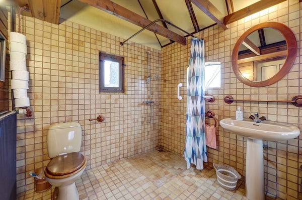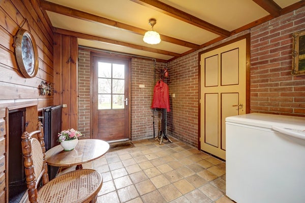 In deze omgeving komen de mensen via de achterdeur naar binnen. Laten we daar dan beginnen. Via de achterdeur kom je binnen in een ruime entree met toegang tot de woonkamer en de badkamer. In de ruime retro badkamer is een ligbad, een douche, een vaste wastafel en een toilet. De woonkamer is van een mooi formaat en beschikt over stoere plavuizen met vloerverwarming, een fraai balkenplafond, openslaande deuren naar de tuin en diverse knusse nisjes en zithoekjes. De houtkachel versterkt de gezellige sfeer in dit huis. Aan de voorzijde is de woonkeuken die qua kleurstelling mooi is doorgetrokken in dezelfde stijl als de woonkamer. Er is nog een kleine hal naar de officiële voordeur en tevens is er een opkamer met daaronder een kleine kelder.