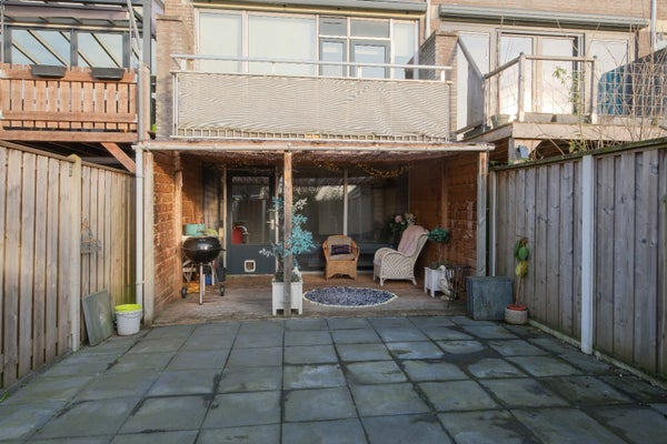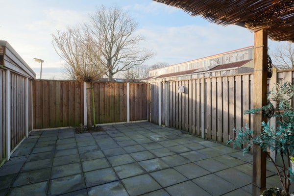 Buiten is het minstens zo aantrekkelijk: de woning beschikt over een zonnige tuin op het zuidwesten waar je de hele dag kunt genieten van de zon. De fijne overkapping maakt het mogelijk om ook bij minder weer comfortabel buiten te zitten. Genoeg privacy, geen achterburen, hier is het heerlijk rustig wonen.